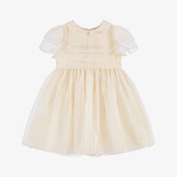 Simply beautiful for girls, a pale beige cotton dress from luxury Italian label, Emporio Armani. Soft and lightweight, it has a lovely embroidered cutwork pattern detailed with Eagle logos for a distinctive designer touch. The chic, A-line silhouette is complemented by pretty flutter sleeves and a stylish keyhole button fastening on the back. The dress is lined with voile for comfort.