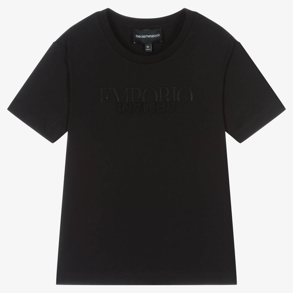 An understated black T-shirt for girls by Emporio Armani, made from soft cotton jersey. The raised logo design and tonal embroidery on the front give this comfortable, casual piece a luxury twist. A glittery Eagle logo on the chest adds a touch of sparkle.