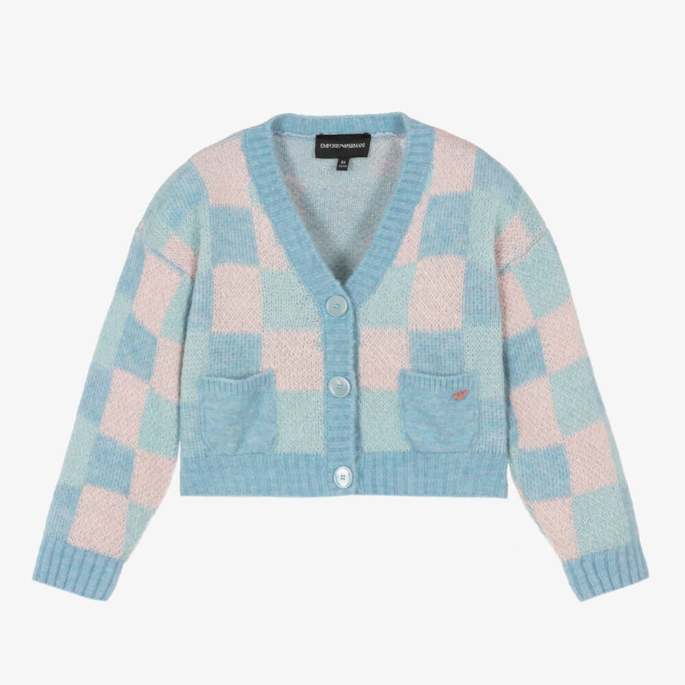 Pink and blue check cardigan for girls by Emporio Armani, in a soft and fluffy wool blend knit. This stylish V-neck design fastens with pearlised buttons and has two patch pockets on the front. Ribbed trims create a cosy feel and the brand's pink Eagle logo charm on the pocket adds a distinctive designer detail.