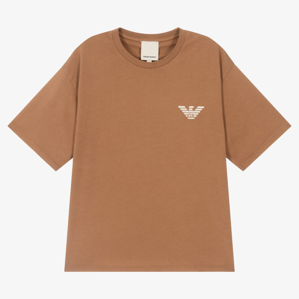 Brown cotton Mini-me T-shirt for girls by Italian designer Emporio Armani. It has the brand's signature Eagle logo printed on the front in white, and a green logo printed on the back. Just right for casual days, it is made in comfortable jersey. This product contains recycled and organic fibres.