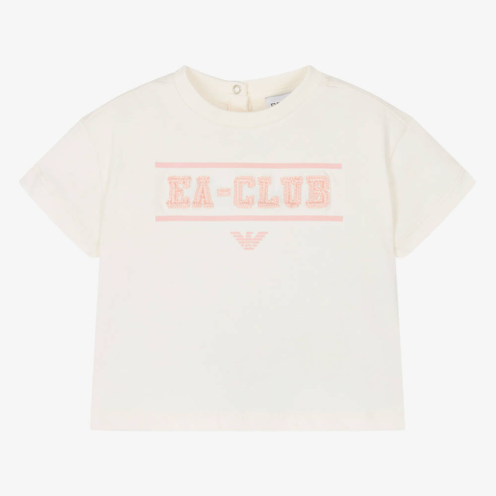 Eye-catching ivory T-shirt for little girls by Emporio Armani, made in soft organic cotton jersey. Making a sweet designer statement, it is embroidered with a pale pink 'EA-Club' logo and printed with the signature Eagle motif. There are poppers on the back to ensure dressing is fuss-free.