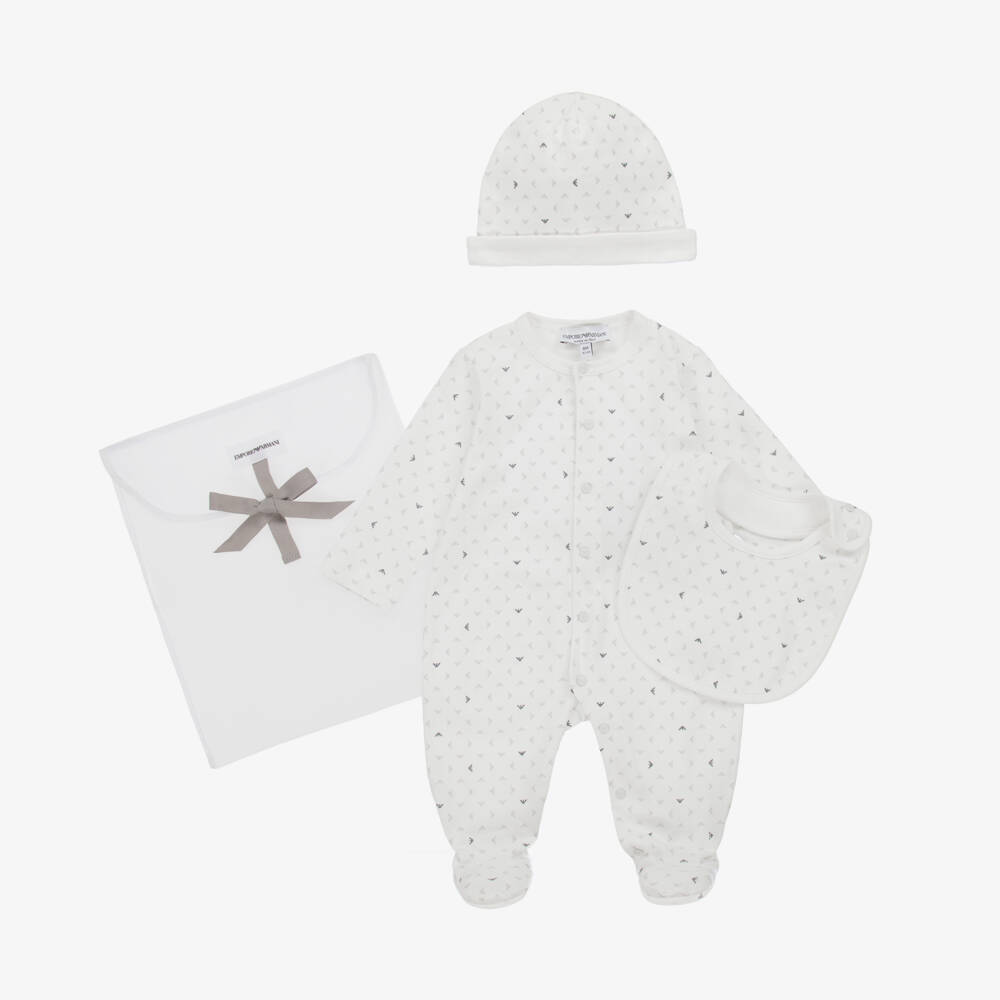 Adorable ivory babygrow, hat and bib set for boys and girls by luxury Italian brand, Emporio Armani. All three pieces are made in beautifully soft cotton jersey and patterned with the designer's distinctive Eagle logo in contrasting shades. The babygrow and bib fasten with logo-embossed poppers for an added designer touch and the set is presented in a branded organza pouch.