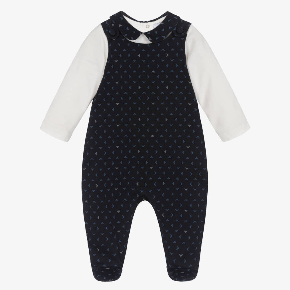 Navy blue cotton babygrow set for boys and girls by Italian designer Emporio Armani, made in comfortable jersey. The ivory bodysuit has a navy blue Peter Pan collar patterned with the brand's signature Eagle logo in contrasting blue and grey. It fastens with easy-to-use logo poppers on the back and between the legs. Patterned with logos, the coordinating dungaree-style babygrow fastens with buttons on the shoulders and with poppers between the legs.