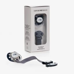 Baby boys pale blue dummy and clip set with the eagle logo branding by Emporio Armani. The dummy has an anatomical silicone teat with a hard plastic holder and a clip with a striped fabric strap to fasten onto clothing.