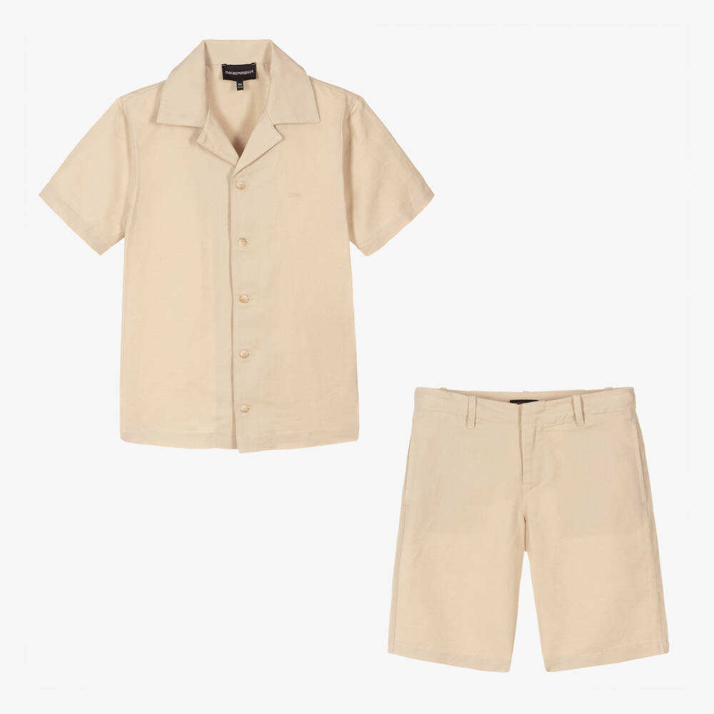 Beige shirt and shorts set for teen boys from Italian label Emporio Armani. Comfortable in linen and cotton, both pieces are made in a soft, lightweight and breathable weave, and signed with tone-on-tone Eagle logo embroidery. The short-sleeved shirt has a revere collar and smart mock-horn front buttons. The shorts have a hidden front zip and button fastening, side pockets and a buttoned back pocket. This outfit is ideal for casual or occasion wear.