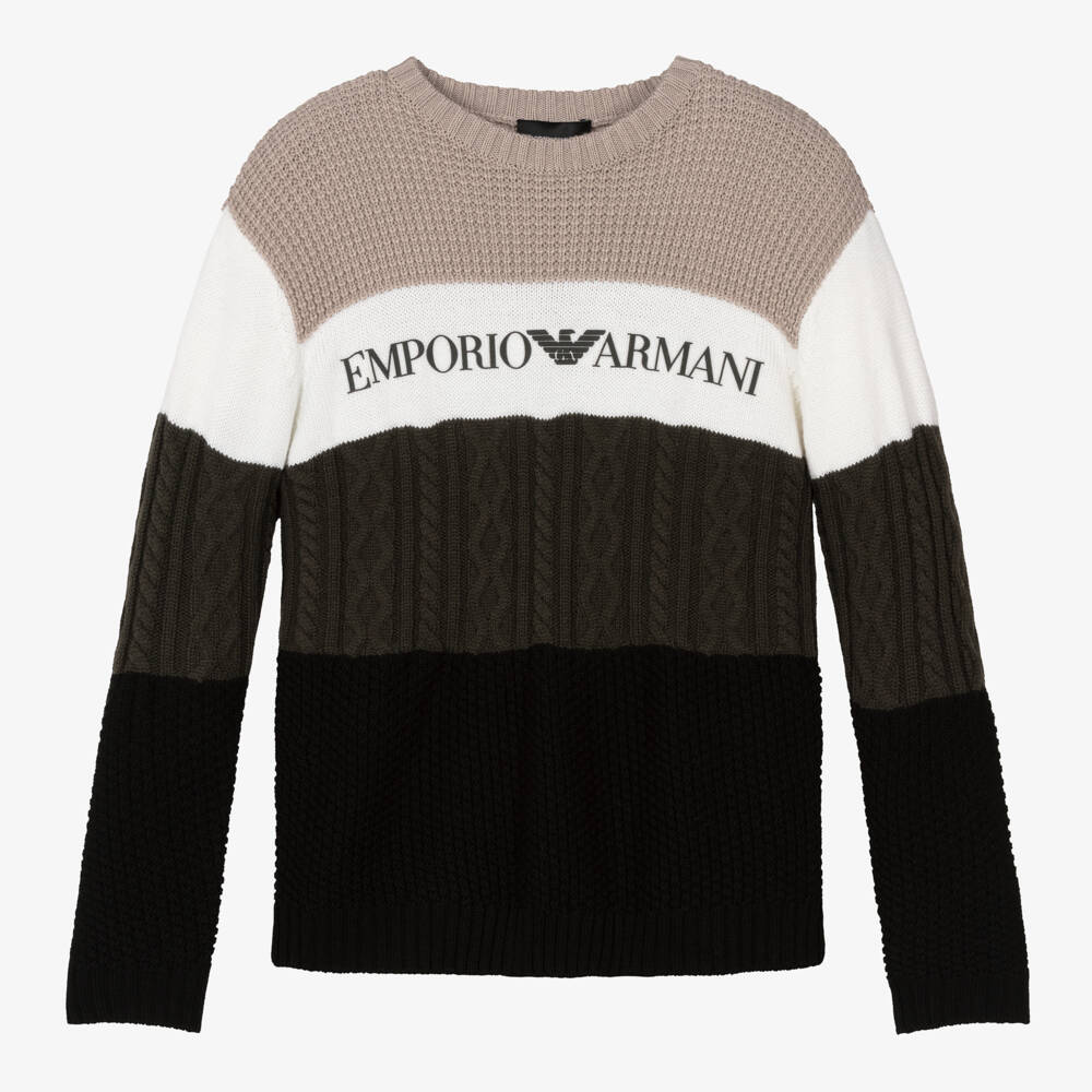 A striped sweater for teen boys by Italian brand Emporio Armani, with a bold, rubberised logo on the front. In complementary shades of beige, ivory and green, this warm pullover has been knitted in differing patterns for added texture and a contrast finish. It is made in a mid-weight wool blend, making it an ideal choice for layering in colder temperatures.