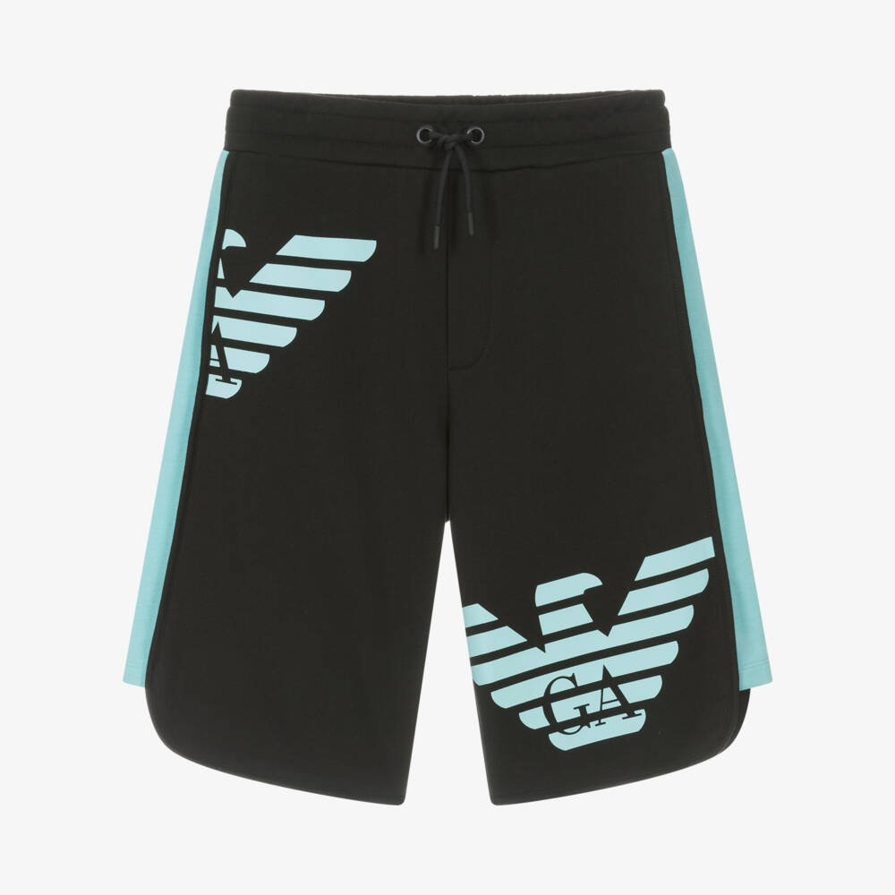 Black and turquoise blue shorts for teen boys by Italian fashion house Emporio Armani. These sweat shorts have iconic Eagle branding printed across the front, with matching colour side panels and a rubberised logo on the back. They have useful side pockets and faux drawstring detail on the elasticated waistband. So stretchy and comfortable, they are made in luxuriously soft, medium-weight jersey.