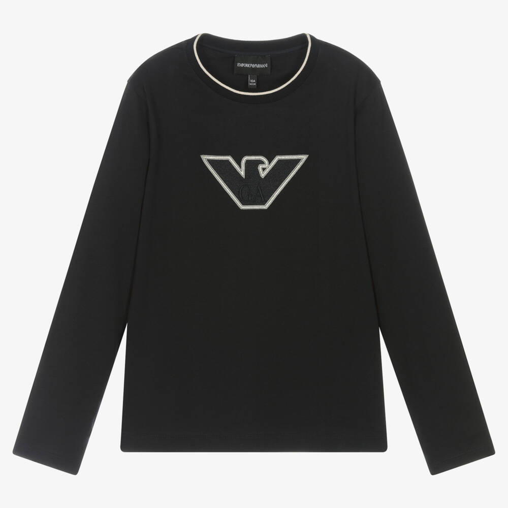 Very dark navy blue top for teen boys by iconic Italian brand Emporio Armani. Ideal for making a designer statement, the brand's large, signature Eagle logo is appliquéd on the front with a silver and ivory outline. It is made in comfortable jersey, with a white trim around the ribbed neckline.