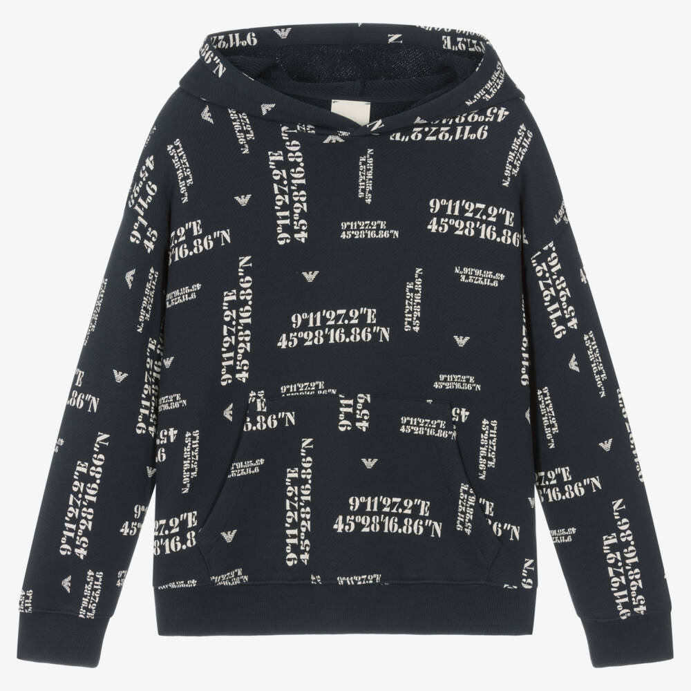 Casual hoodie for teen boys by luxury Italian brand Emporio Armani, in a dark navy blue. Patterned in a cool all-over coordinates print, incorporating the designer's signature Eagle logo, this comfortable hoodie is made in soft organic cotton. It has ribbed trims and for a sporty look, there is a large pouch pocket on the front.