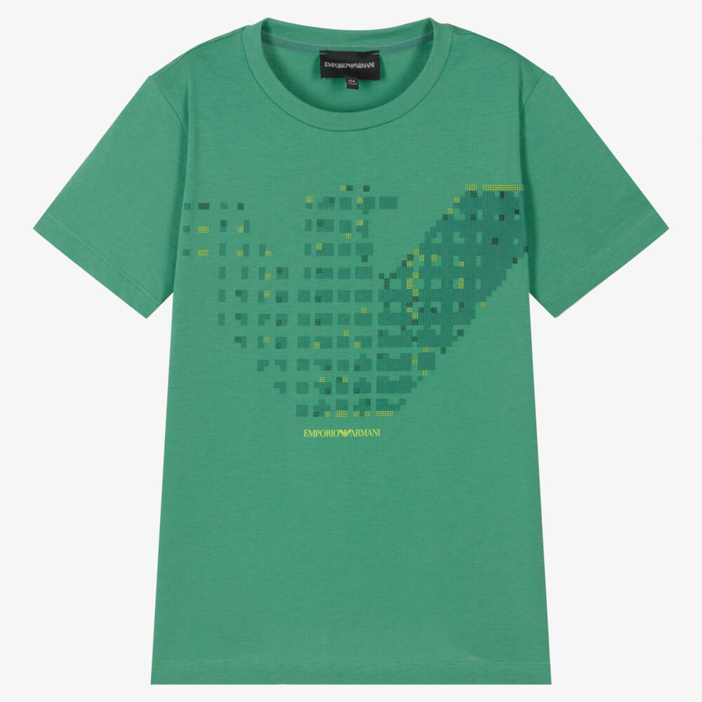 Cool crew neck T-shirt for teen boys by Emporio Armani, in an everyday shade of green. It has a large modern digital pixel Eagle logo print on the front for an edgy look, and is made in soft cotton jersey for casual comfort. The T-shirt contains recycled and organic fibres.