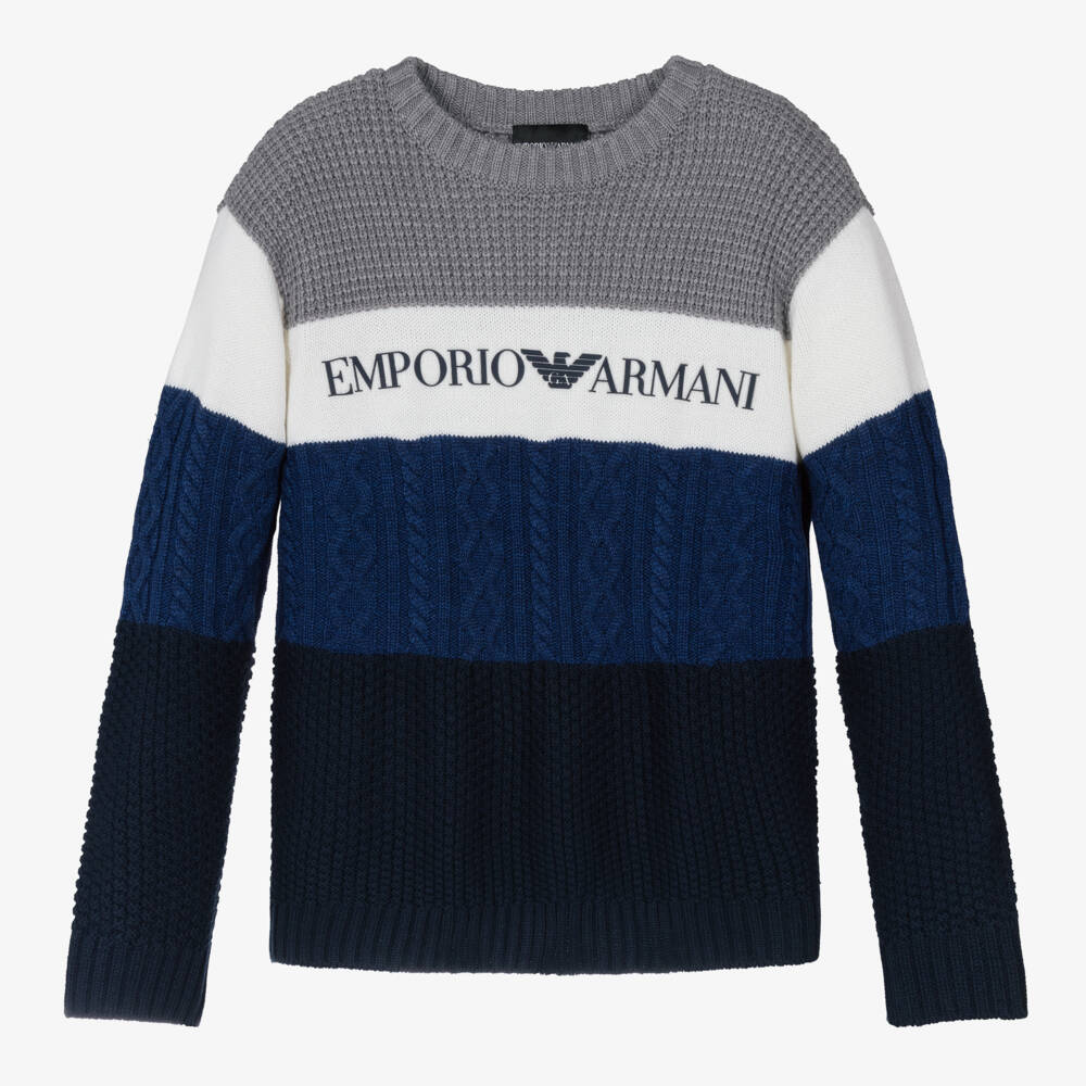 A striped sweater for teen boys by Italian brand Emporio Armani, with a bold, rubberised logo on the front. In complementary shades of grey, ivory and blue, this warm pullover has been knitted in differing patterns for added texture and a contrast finish. It is made in a mid-weight wool blend, making it an ideal choice for layering in colder temperatures.