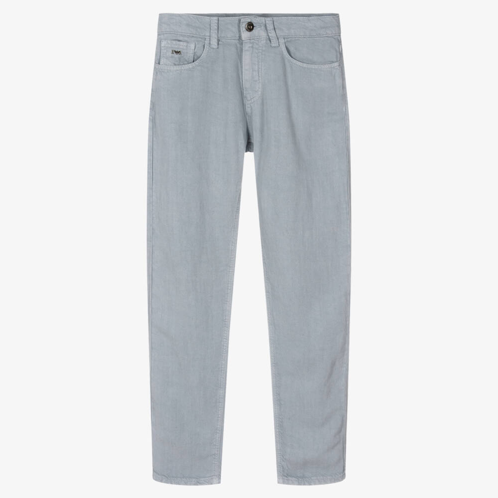 Light blue trousers for teen boys by Emporio Armani, with a metal EA logo plate on the front and a metal Eagle logo plate on the back. Designed in the style of jeans, they are made in a soft lyocell and linen blend. They have classic five pocket jeans styling and a branded button and zip fastening for an extra designer touch.