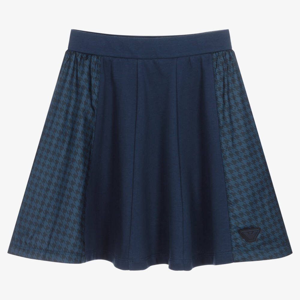 Teen girls cotton skater skirt from luxury brand Emporio Armani, in navy blue. Appliquéd on the front and back are the label's Eagle and Emporio Armani logo badges for added designer appeal. The sides are trimmed with silky fabric patterned with a tonal blue houndstooth design. This cool multi-textural style is made in stretchy, mid-weight jersey, with an elasticated waist for comfort and a good fit.