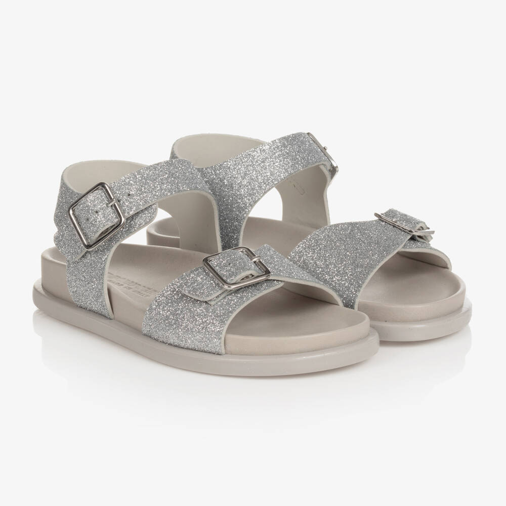 Teen girls will make a statement in these glittery silver sandals by Emporio Armani. With a contoured leather footbed, these feminine sandals have two adjustable straps detailed with silver buckles for a secure fit. They are finished with non-slip rubber soles for a grippy tread.