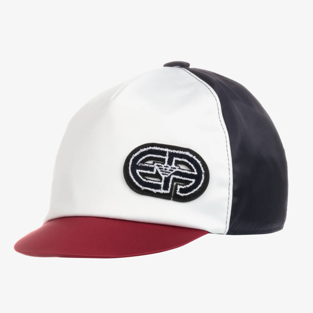 Little boys red, white and navy blue cap by Emporio Armani. Made in silky nylon, this cute hat has a stiff peak and a logo appliqué on the front with an elasticated back.