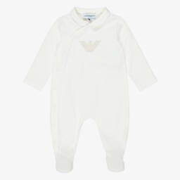 A lovely off-white babygrow for boys and girls by Italian brand Emporio Armani. The front has an adorable alphabet display embroidered in blue and beige, incorporating the brand's logos for a designer touch. Made in comfortable cotton jersey, this sweet babysuit has an asymmetric popper fastenings down the front to help with dressing.