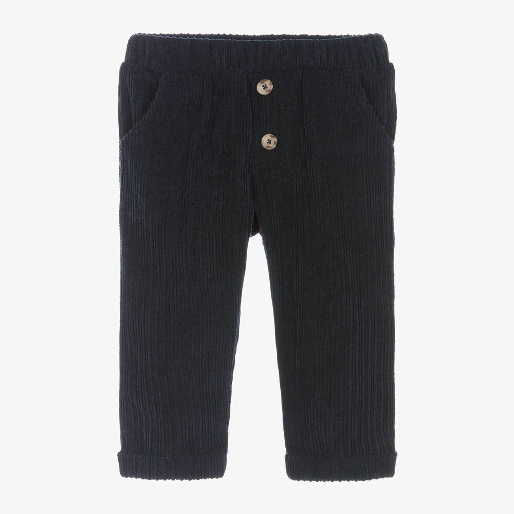 Navy blue trousers for little boys by Everything Must Change. Made from soft and stretchy corduroy, they have decorative buttons and useful slanted pockets on the front, fixed turned-up cuffs, and a comfortable elasticated waist.