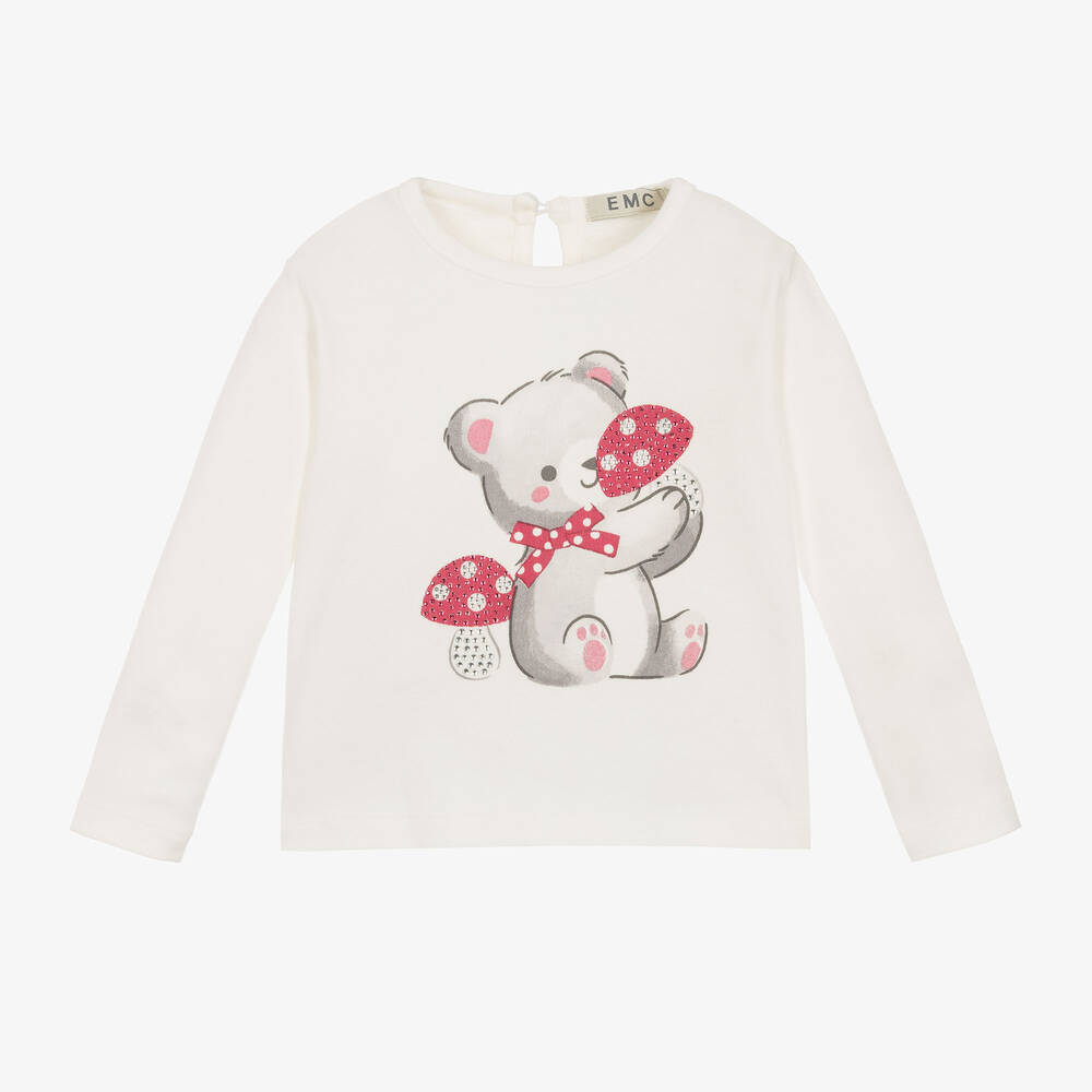 An adorable ivory long-sleeved top for little girls by Everything Must Change. Made from soft cotton jersey, it is printed with a pale grey teddy bear and pink toadstool design on the chest for a cute look. Embellished with sparkly diamantés, it has a keyhole button fastening on the back for a neat finish.