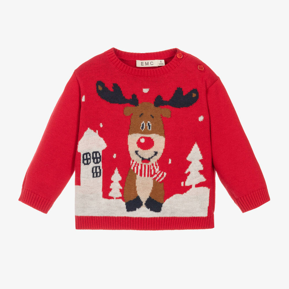 Lovely for the festive season, this red long-sleeved sweater for little boys and girls is by Everything Must Change. Knitted in a lovely soft cotton and wool blend, it has a cute jacquard reindeer design on the front, tonal ribbed trims, and pearlescent buttons on one shoulder for a neat finish.