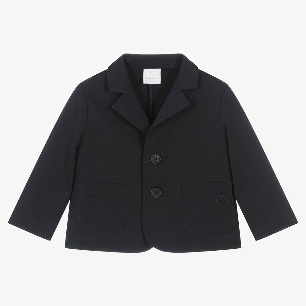 Stylish navy blue blazer for little boys from Italian brand Falcotto by Naturino. Made in a soft cotton blend jersey, this single-breasted jacket has a smart revere collar. There are patch pockets on the front, one with a cute tonal embroidered chick logo and button fastenings.