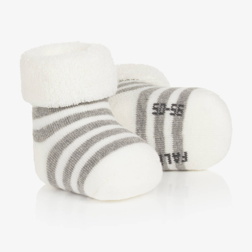 Sweet ivory socks for baby boys and girls by Falke, finely knitted in the softest cotton blend. They are patterned in grey stripes, and have folded ankle cuffs for added cosiness on delicate little feet.