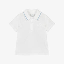 Classic blue polo shirt for little boys by Fendi, made in soft cotton jersey. It features a single pale blue stripe on the white ribbed collar and a branded button placket. For instant brand appeal, an embroidered logo crest can be seen on the chest, completing the luxurious look.