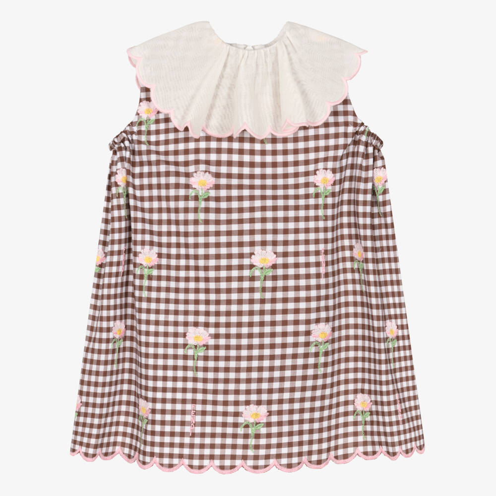فستان قطن جينغهام لون بني وعاجي للمولودات