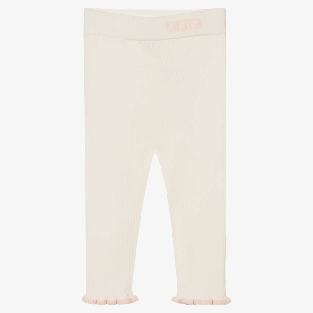 Baby girls luxury ivory ribbed leggings by Fendi. Knitted in a soft and comfortable viscose blend, the ankles are highlighted with pink ruffle trims and there is an FF logo badge stitched at the waistband.