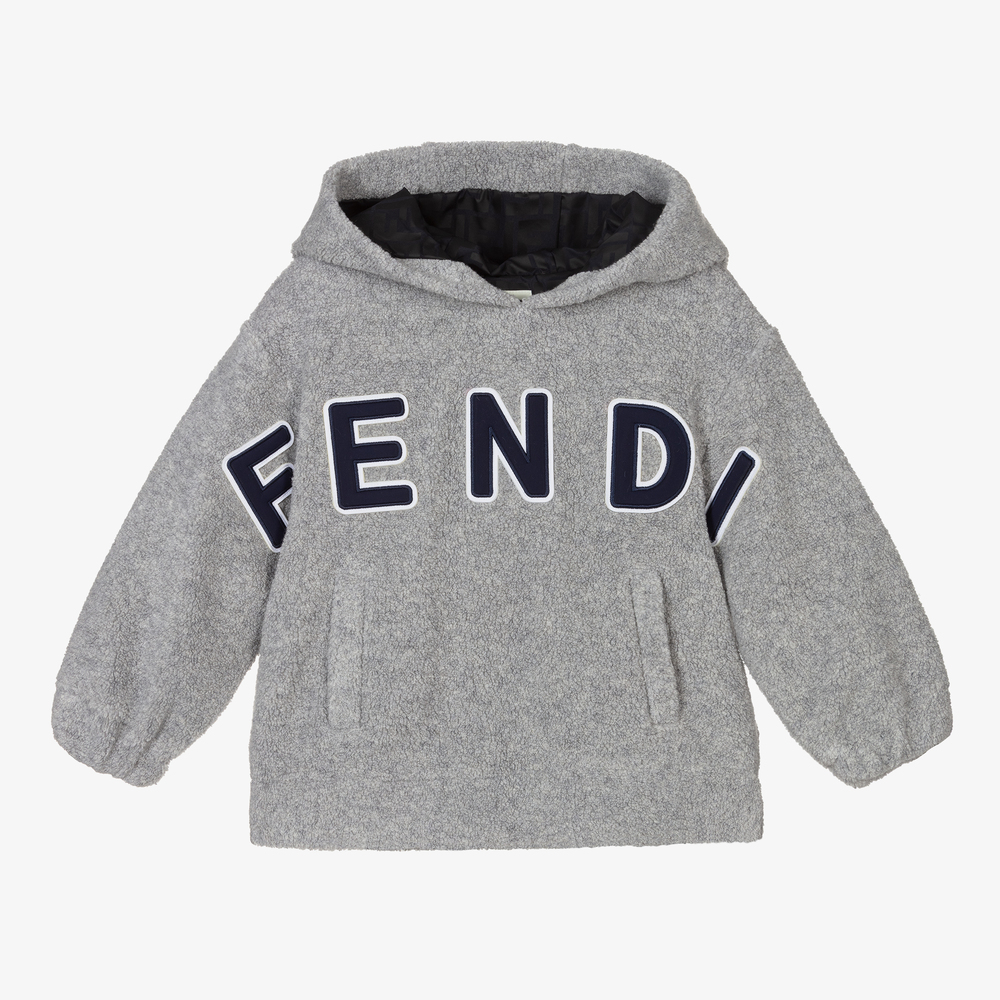 Boys grey hoodie by luxury Italian brand Fendi, made in soft wool-blend sherpa fleece. This style has dropped shoulders for a slouchy fit and has the brand's logo appliqué lettering across the front. The hood is lined with smooth nylon printed with the iconic FF logo. Lined in soft cotton jersey, it also has side pockets and elasticated cuffs.