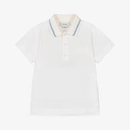 Pale blue polo shirt for boys by luxury Italian brand Fendi, made in soft and comfortable cotton jersey. A classic style with a modern twist, it has a white striped collar and a white, padded-effect Fendi Roma logo on the chest. The branded mother-of-pearl button fastenings give it an elevated finishing touch.