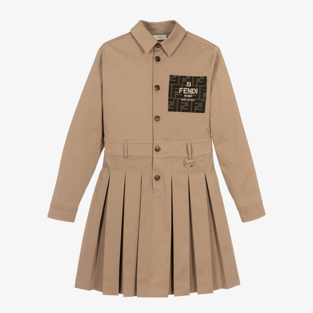 Smart casual beige dress for girls from luxury Italian brand Fendi, made in smooth cotton gabardine. It features an embroidered Fendi Roma logo on the brown FF jacquard pocket. Super stylish and preppy, it has a pointy collar, a pleated skirt and long sleeves with faux horn button fastenings on the front and cuffs.