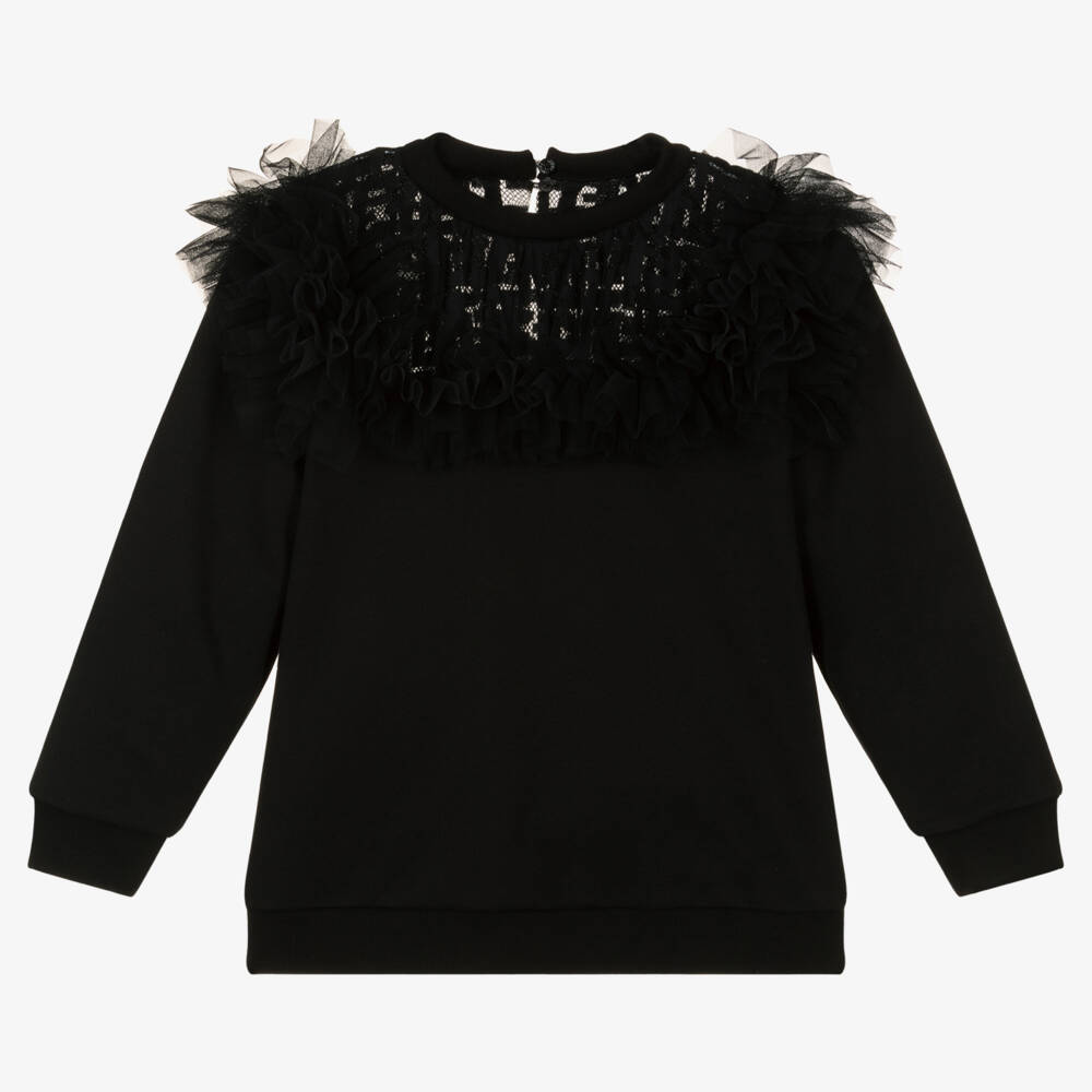 Girls black top by luxury brand, Fendi. Inspired by the womenswear collection, this elegant design is made in mid-weight and stretchy cotton sweatshirt jersey. There are feature tulle ruffles at the shoulders and a square cut neckline with a soft FF lace insert on the front and back.