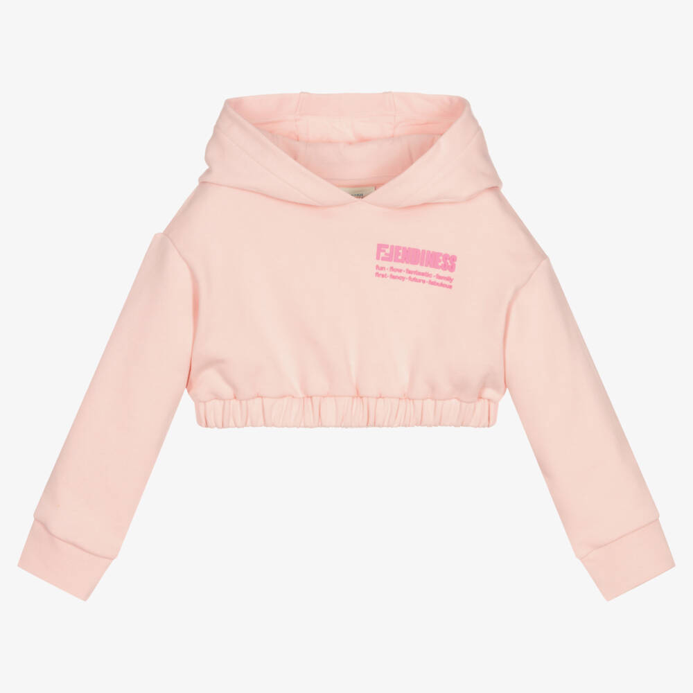 Girls pale pink hoodie by luxury Italian designer Fendi, made in soft cotton sweatshirt jersey. With a cropped fit, the front is trimmed with a raised, rubberised Fendiness logo print. There is an elasticated hem and an attached hood.