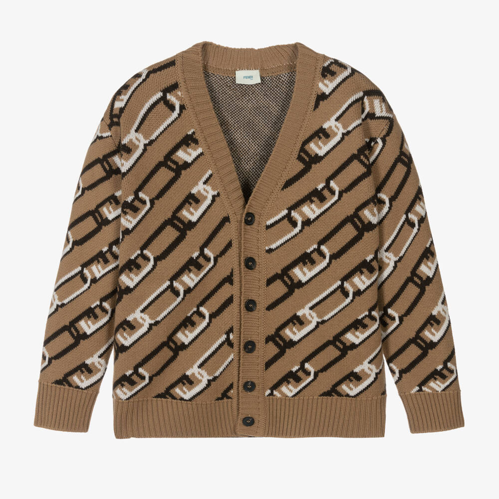 Oversized dark beige cardigan for teen boys and girls by luxury Italian brand Fendi, with a relaxed fit. Inspired by the adults collection, it is knitted in beautifully soft wool, with a dark brown and white Fendi O'Lock Chain pattern. It has ribbed trims for extra cosiness and fastens with logo buttons on the front.