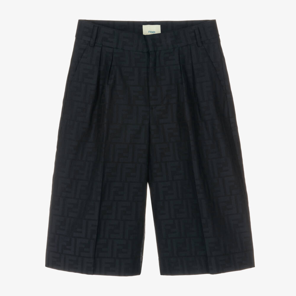 Navy blue cotton shorts for teen boys by luxury designer Fendi, inspired by the adult collection. Expertly crafted in durable twill, these Bermuda-length shorts are designed in an all-over FF logo pattern for instant brand recognition. They are lined in silky smooth viscose, with pleated details on the front and slanted pockets on the hips. They fasten neatly with a hook, button and zip.