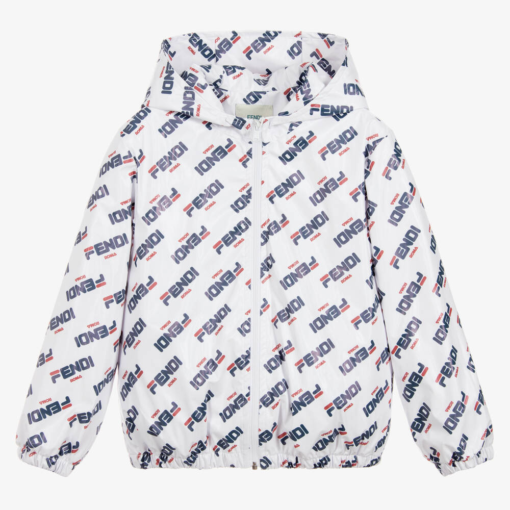 Luxurious white showerproof jacket for baby boys and girls by Fendi Mania, the exciting collaboration with sportswear brand Fila. It is lined in cotton jersey, fastens with a zip and comes with a drawstring pouch.
