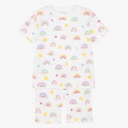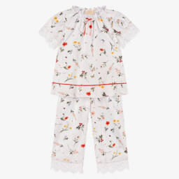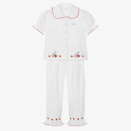 Adorable white pyjamas for girls from Flower Fairies™ by Childrensalon, embroidered with images taken from the original illustrations by Cicely Mary Barker. They are made in luxurious cotton, blended with flame-retardant fibres free from harmful chemicals and brushed for extra softness. With sweet frills, pink picot trims and piping, the pyjamas have pretty puffed sleeves and fasten with glittery buttons. As a lovely finishing touch, they are delicately embroidered with your child's name on the chest.