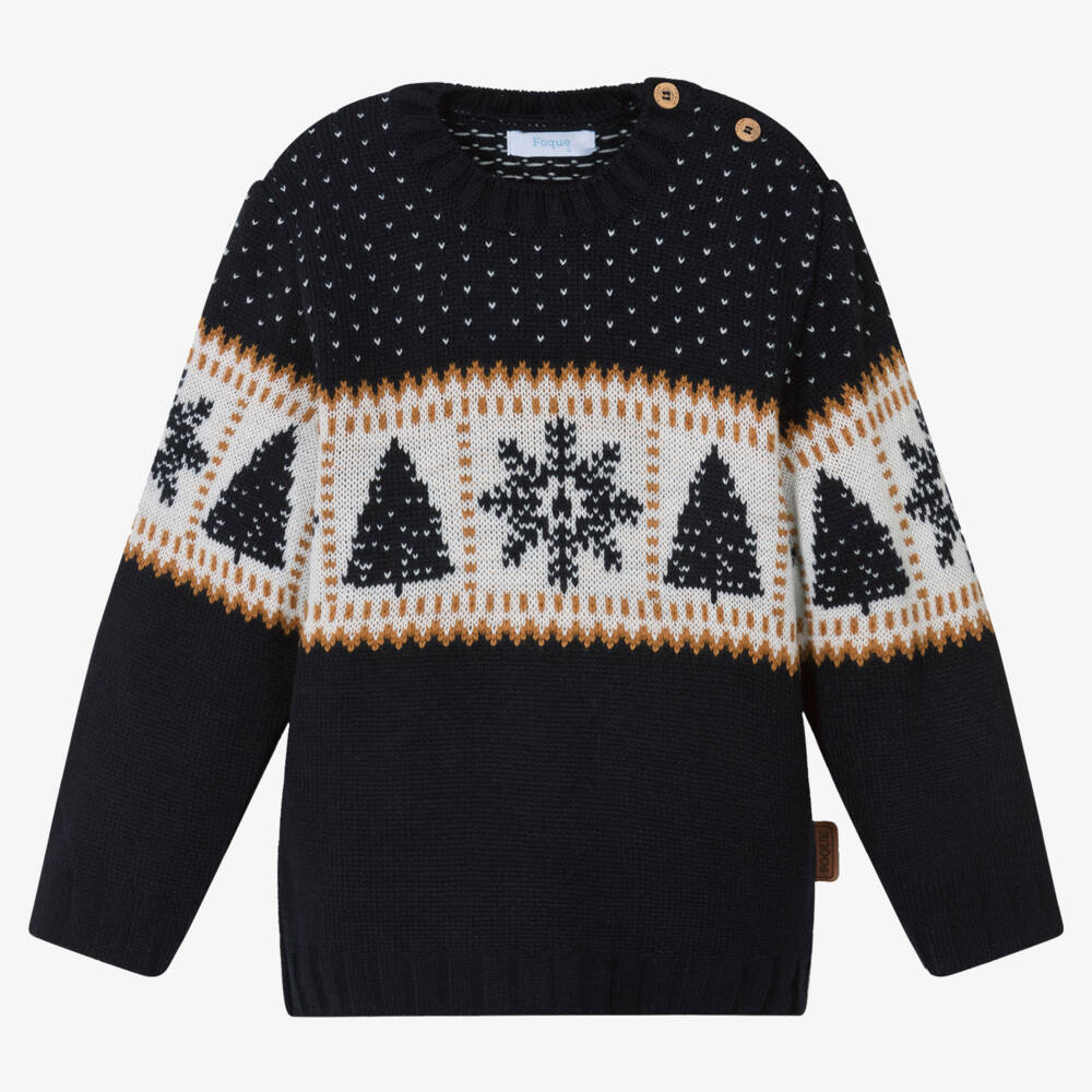 Dark navy blue jumper for boys by Spanish brand, Foque. This soft, lightweight knit has a festive tree and snowflake pattern in white and beige. A classic crew neck style, it has ribbed trims, branded wooden button fastenings on one shoulder and a faux leather logo patch on the side seam.