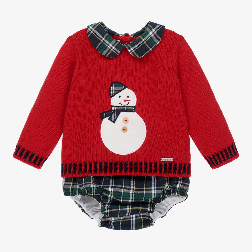 Lovely red and green festive shorts set for boys by Foque, made in a soft wool blend and polycotton twill. Fastening with buttons, the red jumper has navy blue checked trims and a cute white felted snowman appliqué on the front. The matching navy blue and green checked shorts have comfortable elasticated trims.