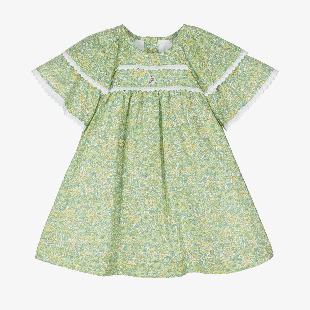 Girls green dress from Foque, made in lightweight cotton. Ideal for warmer days, this beautiful dress has a flared skirt that moves freely and is lined with a delicate voile for added comfort. The all-over floral print has hues of yellow, and white trims across the chest catch the eye. The sleeves are tiered ruffles creating a pretty silhouette. It fastens with buttons on the back for easier dressing.