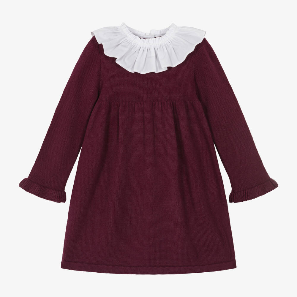 A delightful dark purple knitted dress for girls by Foque. Great for the colder weather, this long-sleeved dress has a fitted bodice with a skirt that flows out from the empire waist. Traditionally styled, there is a white poplin frilled collar and pretty fluted cuffs. It fastens with buttons on the back for a neat finish.