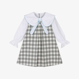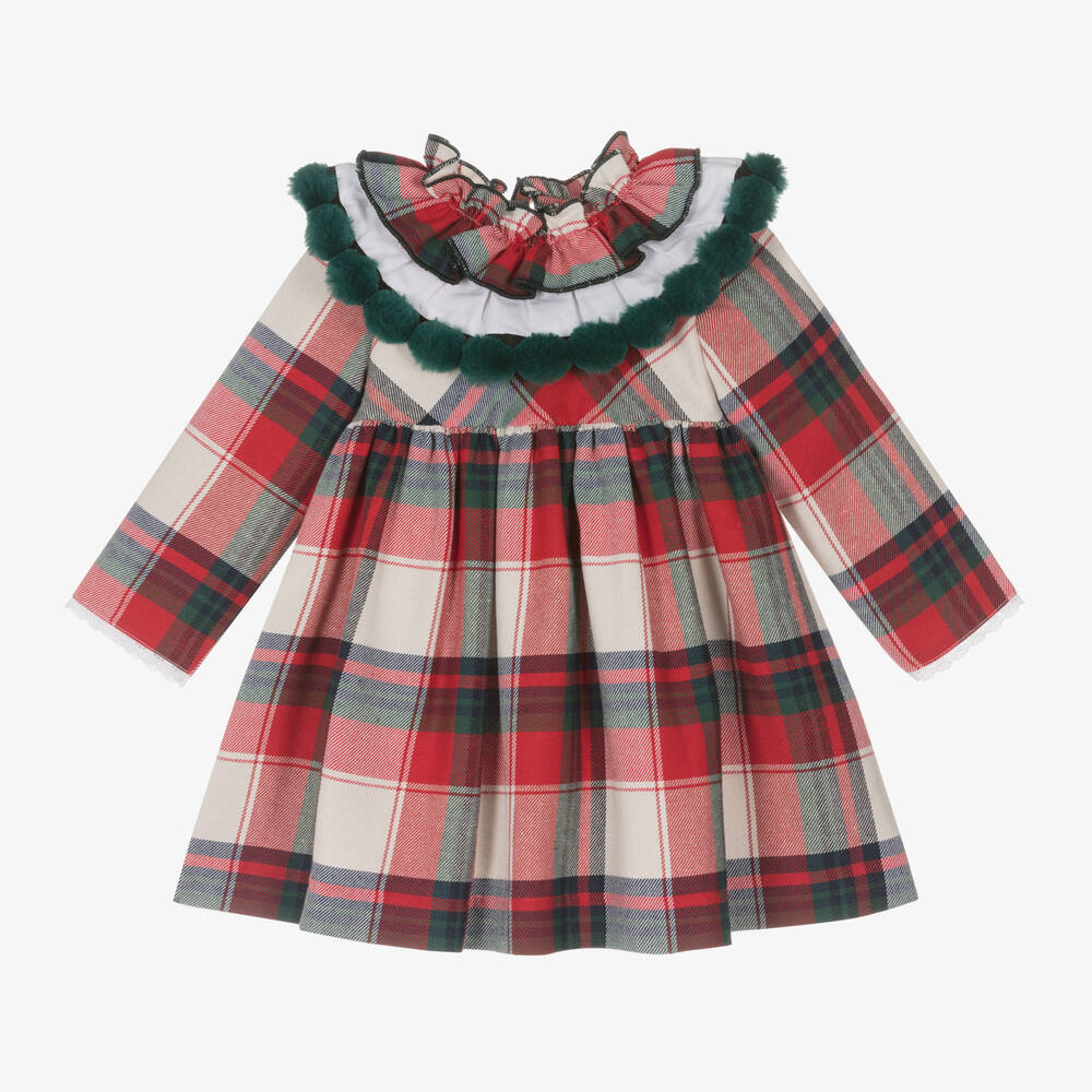 Red, ivory and green dress for girls by Foque, made in a cosy cotton-blend weave. With a traditional tartan print, this lovely dress has ruffles detailed with faux fur pom-poms around the neckline. Further classic detailing includes broderie anglaise trims on the long sleeves. The back fastens with a neat, hidden zip and the lining is made in a cotton mix for comfort.