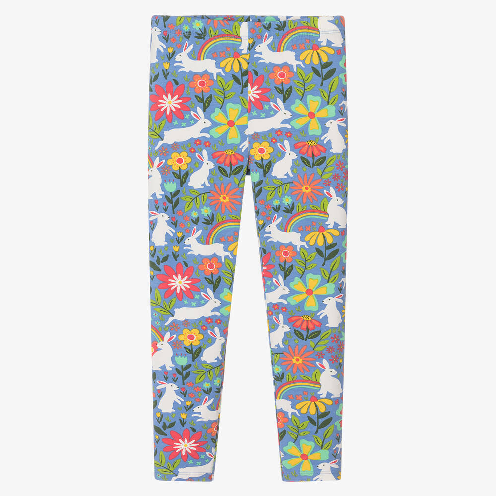 From British brand Frugi, a pair of blue leggings for girls made in soft, stretchy organic cotton jersey. Patterned with adorable bunnies and flowers, these full-length leggings have an elasticated waistband for comfort.