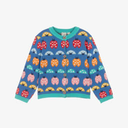 From Frugi for little girls, a sweet multicoloured cardigan knitted in soft organic cotton. The eye-catching colourful stripes are decorated with cute strawberries, flowers and bumblebees that the bright green trims compliment beautifully.