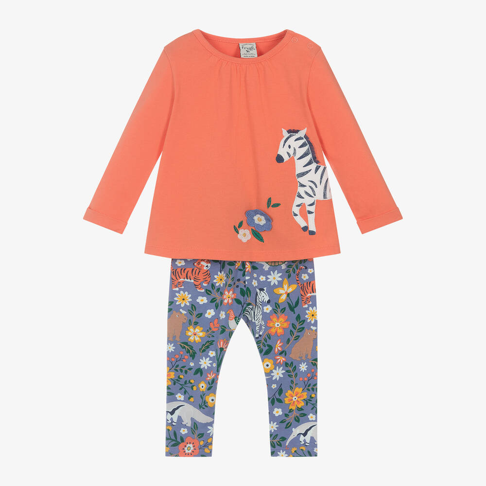 Orange and purple leggings set for little girls by British brand Frugi, made in soft organic cotton jersey. The round neck top has full-length sleeves with turned-up cuffs and shoulder poppers for easier dressing. There is a white zebra appliqué on the front with pretty blue and white flowers. The paired leggings are designed in a colourful print with yellow flowers and friendly zoo animals. They have an elasticated waistband for comfort and movement.