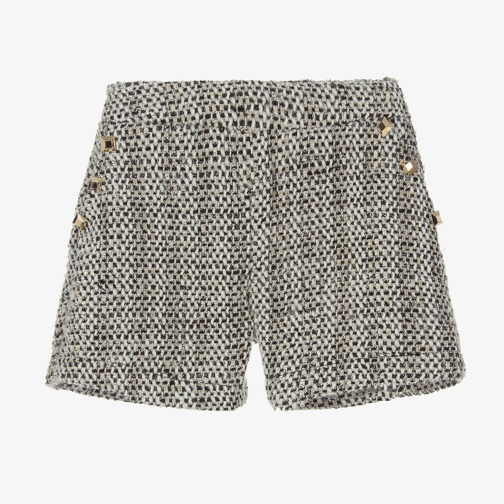 Black and ivory shorts for older girls from H.Love by Fun & Fun. They are made from soft tweed, woven with shiny gold and silver tinsel-like thread for a touch of sparkle. Fastening with a discreet zip on one side, they have slanted pockets with gold-tone stud detailing for a cool finish.