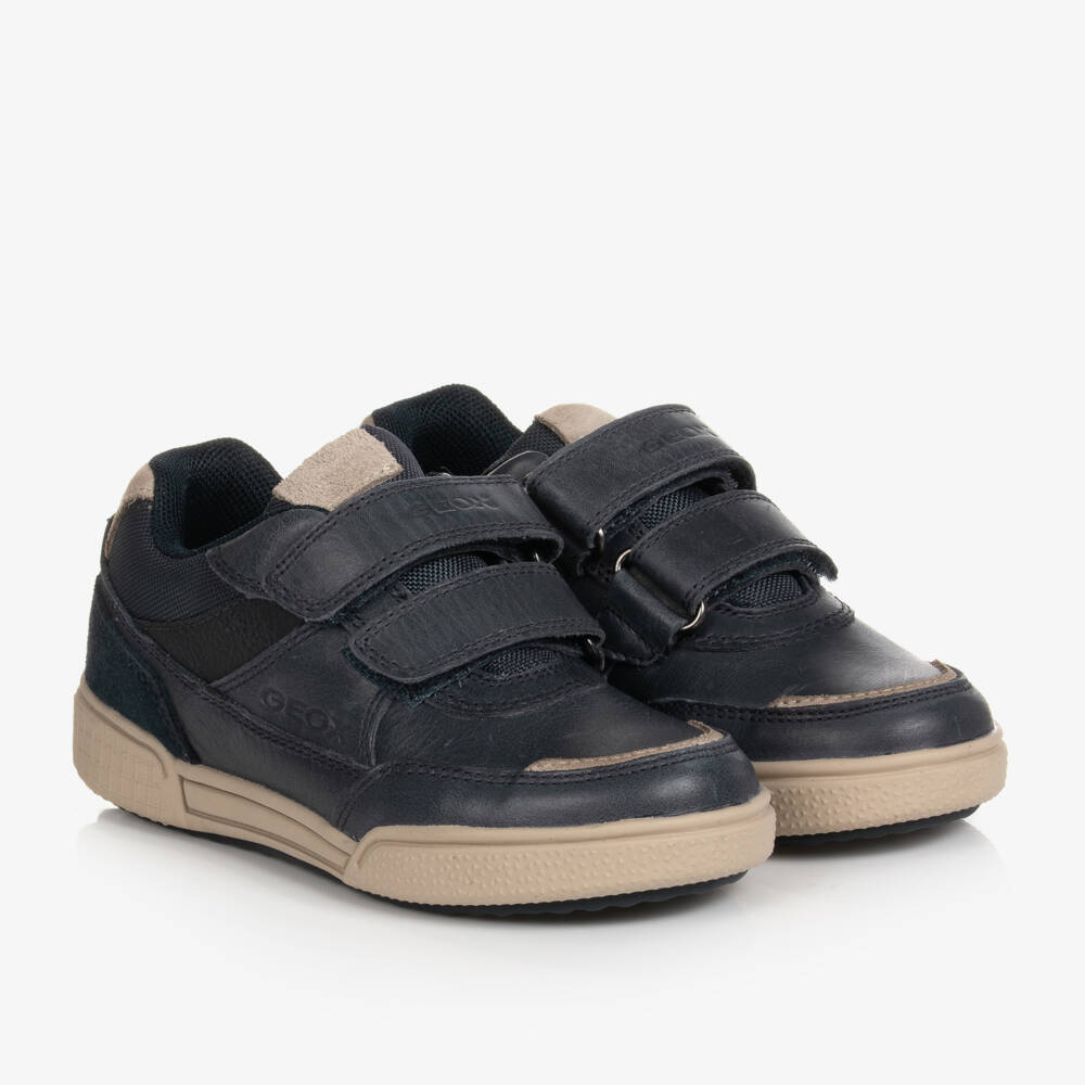 Navy blue leather trainers for boys by Geox, trimmed in mesh and suede. These trainers have a worn vintage effect, a beige rubber outsole and velcro fastenings. The textile lining is softly padded, whilst the leather insole is breathable and antibacterial to preserve freshness throughout the day.
