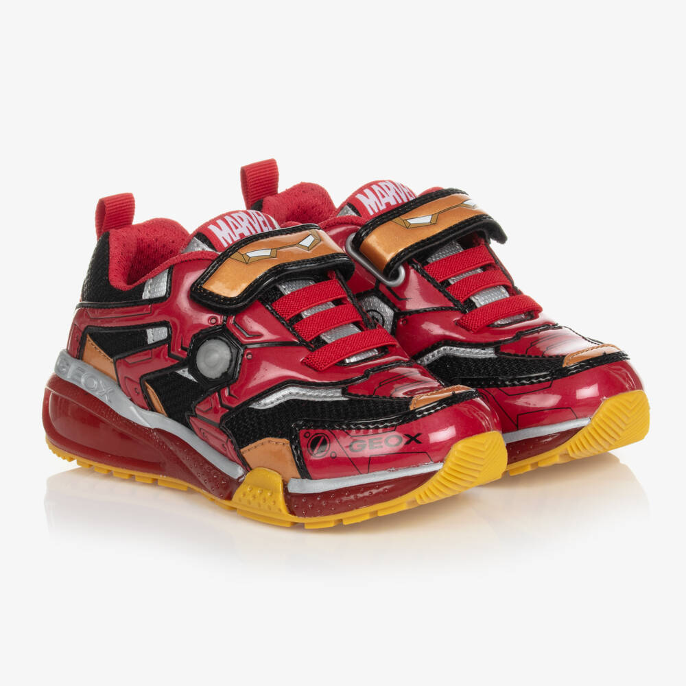Eye-catching red and black trainers for boys by Geox, with flashing lights in the outsole and on the upper. Part of the brand's partnership with Marvel, they take their design inspiration from Iron Man. Combining comfort and style, they are ergonomic in shape with a soft mesh lining, and heel and toe protection. They have a shock-absorbing chrome-free leather insole and flexible, breathable outsoles with a waterproof membrane. For an adjustable fit, they have elasticated laces and a velcro-fastening strap.