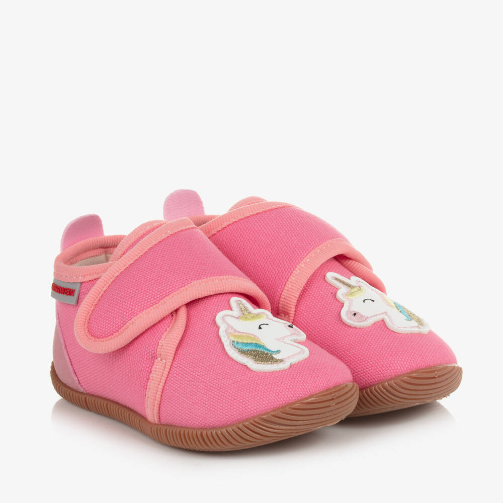 Fun pale pink slippers for little girls by Austrian brand Giesswein. They have cute unicorn motifs appliquéd on the front, with soft suede-feel panels on the back of the heels. They are woven in soft cotton canvas, with a breathable cotton lining, and removable insoles. These lightweight and comfortable slippers have velcro straps for easy fastening, and non-slip rubber soles for support and good grip.