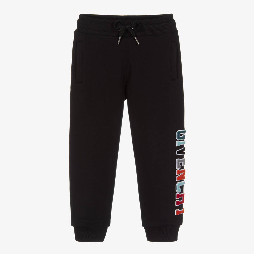 Black joggers for boys by luxury French brand Givenchy, made from super soft cotton jersey. Cool on laid-back days, a colourful raised Givenchy logo is decorated on one leg. They have elasticated rib trims, a drawstring waist and side seam pockets.